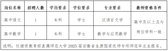 根据《关于做好教育部直属师范大学2025届国家优师专项师范毕业生就业工作的通知》(皖教秘师〔2025〕11号),经研究,2025年安徽省宿松中学招聘2名全额拨款事业编制教师,现将招聘有关事项公告如下: