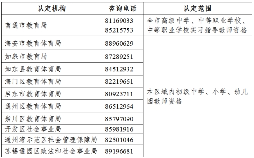 根据《教师资格条例》规定,南通市教育局负责高级中学、中等职业学校教师和中等职业学校实习指导教师的教师资格认定;各县(市、区)教育局负责初中、小学、幼儿园教师的教师资格认定。
