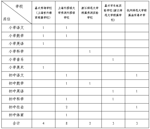 嘉兴秀湖学校(上海世外教育附属学校)、上海外国语大学秀洲外国语学校、浙江师范大学附属秀洲实验学校、嘉兴市长虹实验学校(浙江师范大学附属学校)、杭州师范大学附属油车港中学等5所学校共选聘教师20名。具体选聘单位、岗位如下表: