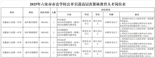 2025年安徽省六安第一中学引进高层次紧缺教育人才共计5名。具体招聘岗位、条件如下: