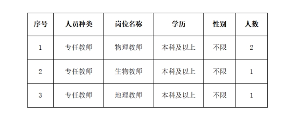 因学校实际用人需求,现招聘专任教师4名。其中,物理教师2名、生物教师1名、地理教师1名。