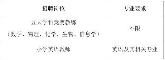 学校因工作需要,现面向社会招聘五大学科竞赛教练、小学英语教师,具体要求如下: