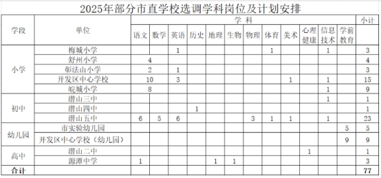 2025年市直学校拟选调教师合计77名。具体选调岗位和计划分配如下表: