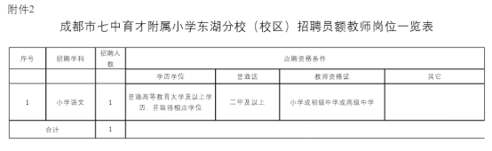 本次招聘员额教师共计1名(招聘岗位详见《成都市七中育才附属小学东湖分校(校区)招聘员额教师岗位一览表》)。