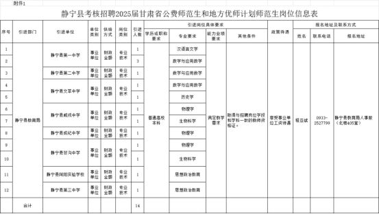 计划考核招聘2025届甘肃省公费师范生和地方优师计划师范生14名,其中静宁一中4名、静宁二中1名、文萃中学2名、威戎中学2名、成纪中学1名、甘沟中学2名、阿阳实验学校1名、静宁三中1名。具体招聘岗位信息见《静宁县考核招聘2025届甘肃省公费师范生和地方优师计划师范生岗位信息表》(附件1)。
