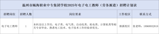 为进一步加强教师队伍建设,更好地满足学校教育教学工作需求,现面向社会公开招聘电子电工教师1名(劳务派遣)。招聘岗位及相应条件公告如下: