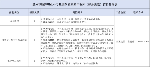 为进一步加强教师队伍建设,更好地满足学校教育教学工作需求,现面向社会公开招聘语文教师、服装设计与工艺专业教师、电子电工教师各1名(劳务派遣)。招聘岗位及相应条件公告如下: