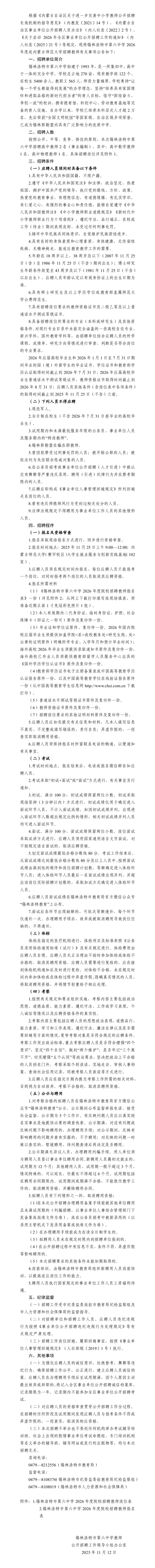 锡林浩特市第六中学2026年度赴内蒙古师范大学招聘教师公告