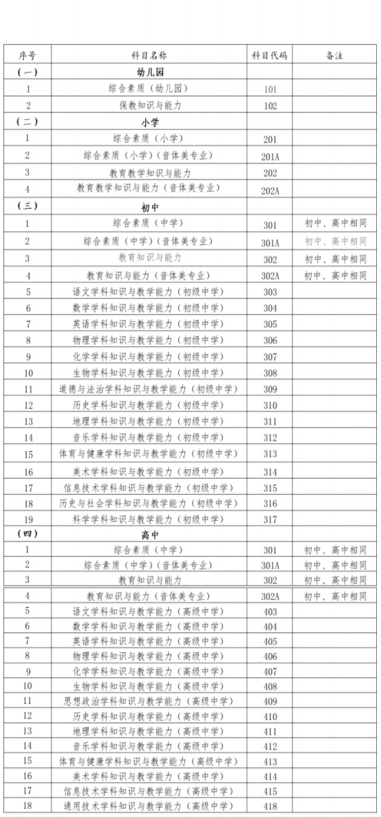 (五)初中、高中、中职文化课类别面试已增设“心理健康教育”“日语”“俄语”学科,以上三个学科的笔试科目三《学科知识与教学能力》结合面试一并考核;小学类别面试增设“心理健康教育”“信息技术”“小学全科”学科。请有意报考上述学科教师资格证的考生在笔试报考时选择相应的公共科目(201、202或301、302)报考。