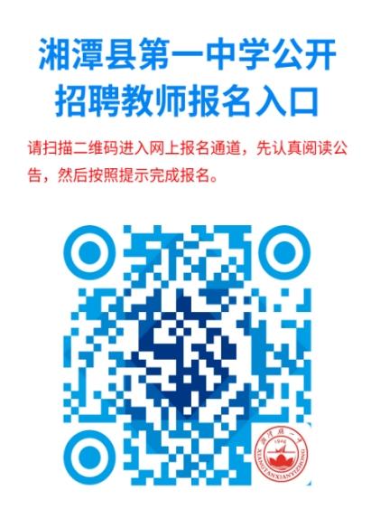2.报名方式:采取网上报名方式。在报名时间内应聘人员登录湘潭县第一中学校园网(http://www.xtxyz.com)或“湘潭县第一中学”微信公众号,扫描“湘潭县第一中学2026年公开招聘教师报名二维码”,下载并填报《湘潭县第一中学2026年公开招聘教师报名登记表》(详见附件3,以下简称“《报名登记表》”),上传资料完成报名,不接受其他形式报名。