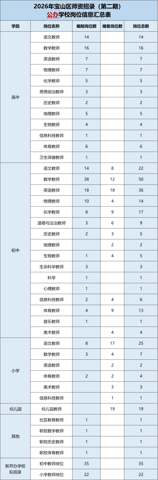 宝山区师资招聘岗位信息