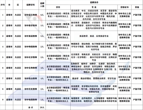 2020年盘锦市大洼区义务教育学校计划招聘岗位需求信息表(初中)