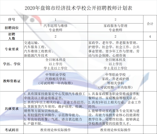 2020年辽宁省盘锦市经济技术学校教师招聘计划表