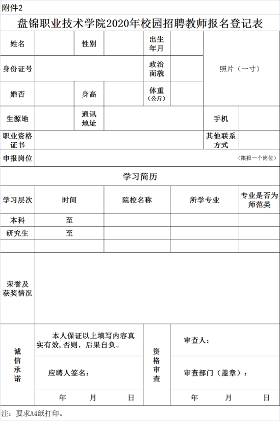 2.《盘锦职业技术学院2020年校园招聘教师报名登记表》