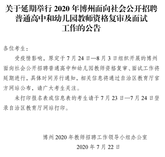 关于延期举行2020年新疆博州普通高中和幼儿园教师招聘资格复审及面试工作的公告