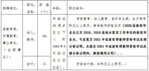 根据国家和省关于应对新冠肺炎疫情影响,做好事业单位公开招聘高校毕业生工作,特别是人社部、教育部、中央编办、财政部关于做好2020年中小学、幼儿园教师公开招聘工作的通知精神,结合事业单位编制、岗位空缺情况及工作需要,按照“公开、平等、竞争、择优”的原则,面向社会公开招聘幼儿教师30名、专业会计2名(全额事业编制)。现将有关事项公告如下: