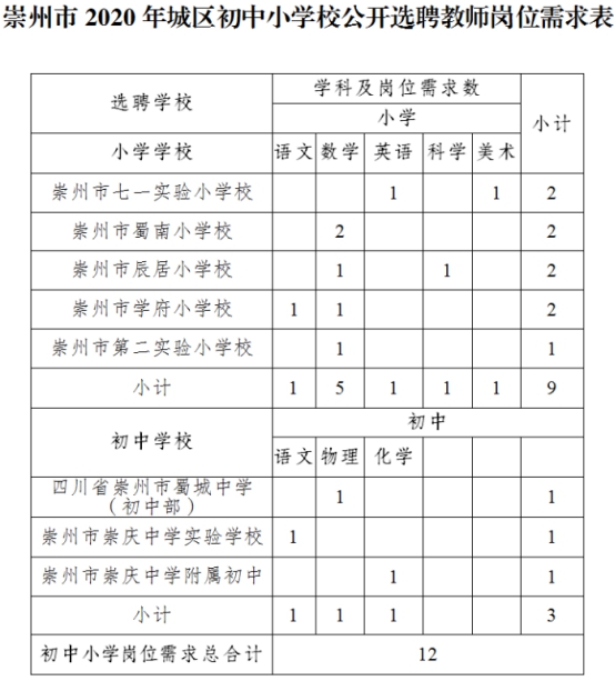 (学科岗位需求情况详见《崇州市2020年城区初中小学校公开选聘教师岗位需求表》<附件1>)等信息。