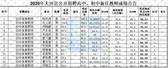 大田县2020年公开招聘高中、初中新任教师成绩公告