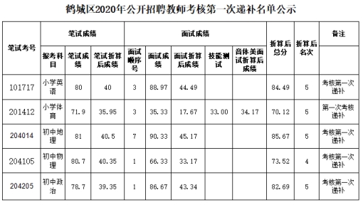 在我区2020年公开招聘教师考核过程中,因小学英语综合排名第2名,小学体育综合排名第4名,初中地理综合排名第1名,初中物理综合排名第3名,初中政治综合排名第1名等5人自愿放弃考核。根据《怀化市鹤城区2020年公开招聘教师公告》有关考核递补的规定,经鹤城区公开招聘教师工作领导小组研究决定,对考核空出名额予以第一次递补如下:依次递补小学英语综合排名第5名的唐静;小学体育综合排名第5名的姚俊霖;初中地理综合排名第5名的唐志滔;初中物理综合排名第4名的向平安;因初中政治综合排名第4名的谭密放弃递补,依次递补初中政治综合排名第5名的郭丽琴。