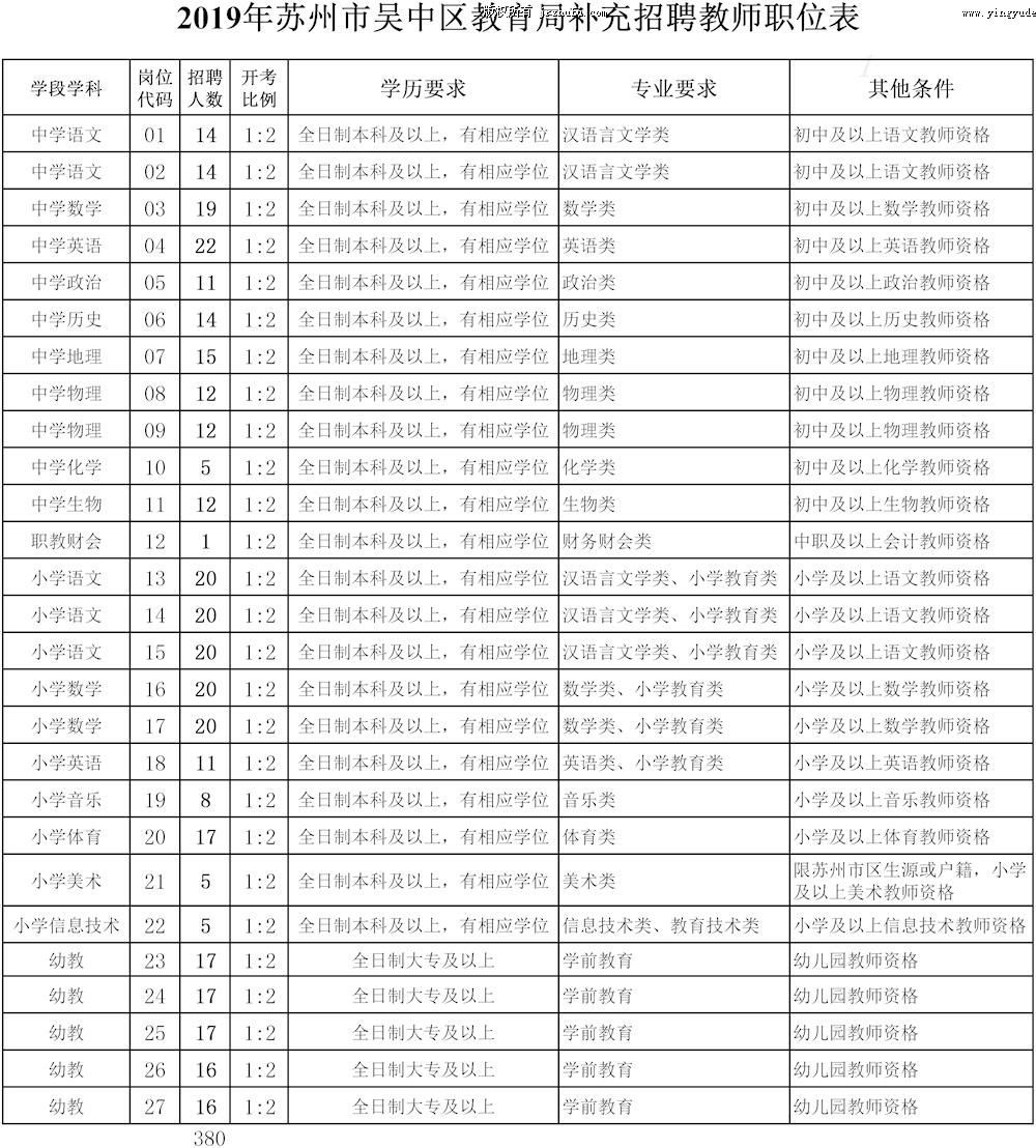 根据《省教育厅省人力资源和社会保障厅关于进一步做好全省中小学校新进教师公开招聘工作的意见》(苏教规〔2006〕1号)有关规定,经苏州市吴中区人民政府同意,2019年苏州市吴中区教育局下属公办学校补充招聘教师380名。现将《2019年苏州市吴中区教育局补充招聘教师简章》(以下简称《简章》)公布如下: