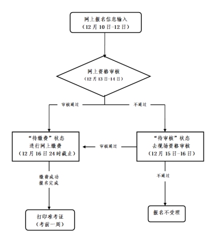 所有经网上及现场资格审核通过的报考人员,都需要在12月16日24时前登陆报名网站,按照网站指引完成网上缴费,逾期不缴费的,视为自动放弃报名。网上缴费后,请报考人员及时登录报名网站核查报名状态,出现“报名成功(已缴费)”时,表示缴费已成功,报名已完成。