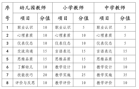 中小学教师资格考试面试满分100分,各项目分值具体如下(中职教师面试分值同中学教师):