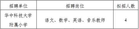 华中科技大学附属小学位于大学主校区校园内,是武汉市示范学校、武汉市素质教育特色学校,全国科学教育、信息技术教育等先进单位和实验基地。因工作需要,现面向社会公开招聘小学教师4人。