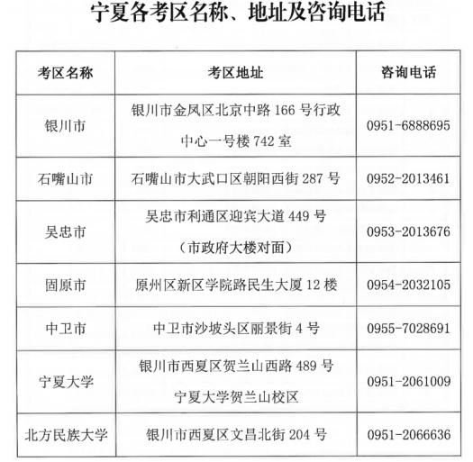 本次考试共设宁夏大学、北方民族大学、银川市、石嘴山市、吴忠市、固原市、中卫市7个考区。其中宁夏大学、北方民族大学2个高校考区,仅限本校在籍学生报考。如因考生个人填报错误,致使无法考试、成绩无效、后续无法认定证书等后果,责任考生自负。