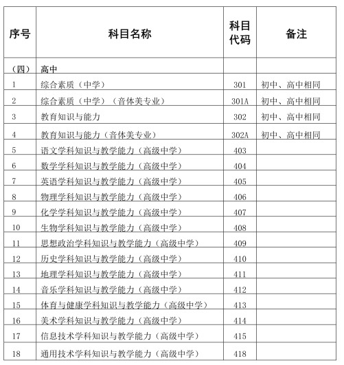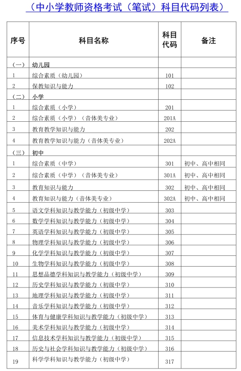(二)根据教育部教师工作司印发的《关于中小学教师资格考试音、体、美专业考生公共科目单独编码的通知》(教师司函〔2017〕34号)精神,音、体、美专业考生的笔试公共科目一、科目二(科目代码201、202、301、302)继续实行单独编码(相应科目代码:201A、202A、301A、302A),考试内容暂与原科目相同。实行单独编码后,音、体、美专业考生在笔试报名时应选报单独编码的公共科目。取得科目201A、202A合格的考生,面试仅限于参加小学类别音、体、美专业科目;取得科目301A、302A合格的考生,面试仅限于参加初中、高中、中职文化课音、体、美专业科目。考生已获得科目201、202、301、302合格成绩,可相应替代科目201A、202A、301A、302A合格成绩;考生已获得科目201A、202A、301A、302A合格成绩,不可替代科目201、202、301、302合格成绩。