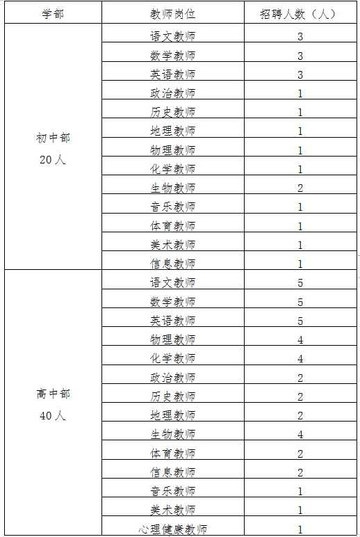1、招聘教师:遵纪守法,师德高尚、热爱教育事业,具有良好的心理素质,强烈的事业心和责任感,善于学习,敢于创新,身体健康。本科以上学历,普通话二乙以上(语言类老师二甲以上),中学教师资格证书,能熟练操作办公软件、校园网络和各种应用信息系统。