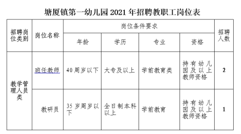 附件:《塘厦镇第一幼儿园2021年招聘教职工岗位表》