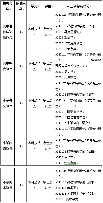 初中历史教师、初中道德与法制教师、小学语文教师、小学美术教师、小学体育教师(跆拳道方向)各1人,共招聘5人。专业名称及代码如下: