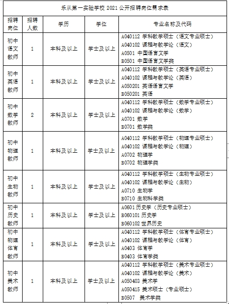根据《广东省事业单位公开招聘人员办法》(省府令第139号)和《2021年顺德区公办中小学面向社会公开招聘教师公告》,结合我校师资需求缺口实际,现就顺德区乐从第一实验学校(初中部)2021年面向社会公开招聘教师公告如下: