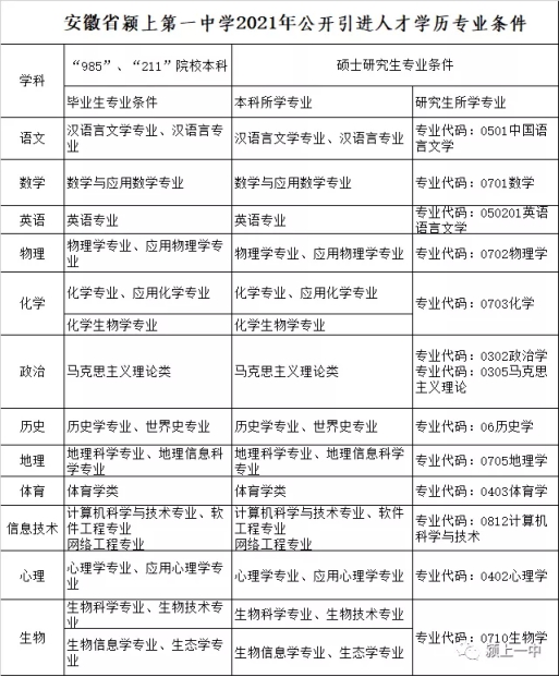 附件:安徽省颍上第一中学2021年公开引进人才学历专业条件