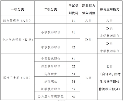 考试科目为职业能力倾向测验和综合应用能力两科。综合管理类、中小学教师类、医疗卫生类《职业能力倾向测验》和《综合应用能力》满分均为150分,笔试总分300分。卫生类《综合应用能力》为合订本,由考生按报考职位作答相应部分。