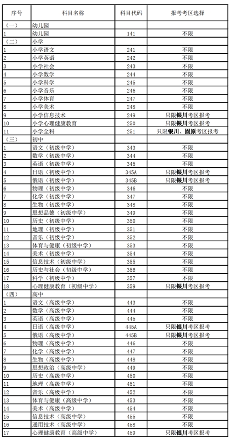 1.参加小学心理健康教育、小学信息技术、心理健康教育(初级中学)、心理健康教育(高级中学)、日语(初级中学)、俄语(初级中学)、日语(高级中学)和俄语(高级中学)面试的考生,统一在银川市考区报考,其它考区不设面试考场。凡报考到银川市以外考区的,不予审核通过;