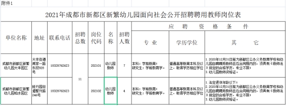 附件1:2021年新都区新繁幼儿园面向社会公开招聘聘用教师岗位表;