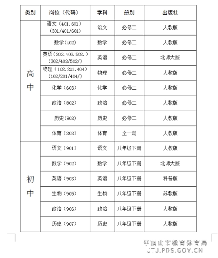 根据《平顶山市教育体育局2021年局属学校校园招聘简章》,按照“公开、平等、竞争、择优”的原则,将对资格复审合格人员进行面试。现将面试各岗位使用教材目录公告如下: