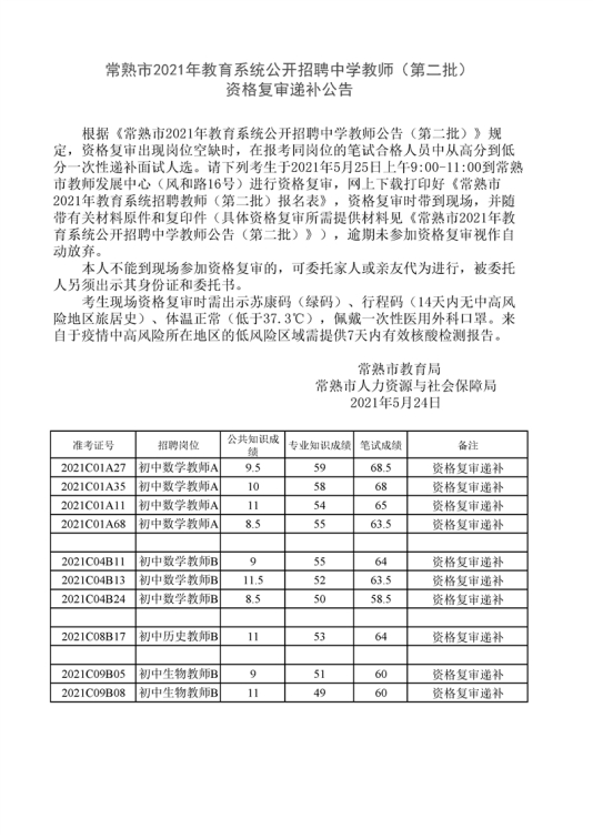 江苏省苏州常熟市2021年教育系统中学教师招聘(第二批)资格复审递补公告