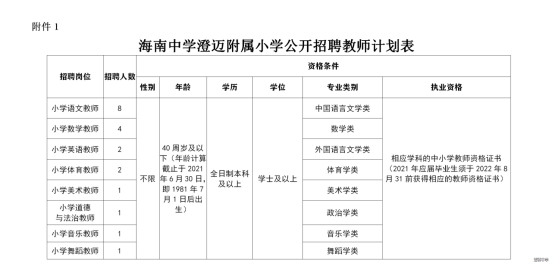 附件:1.《海南中学澄迈附属小学公开招聘教师计划表》