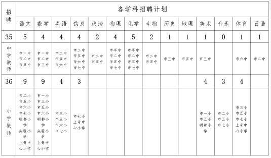 计划直接面试招聘中小学专任教师71人(其中:中学教师35人、小学教师36人),具体岗位计划如下: