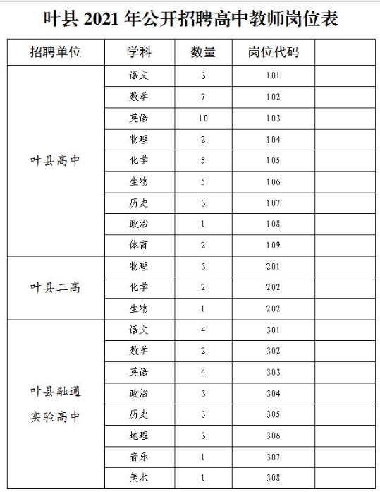 公开招聘正式教师65名,具体岗位见附件《叶县2021年公开招聘高中教师岗位表》。