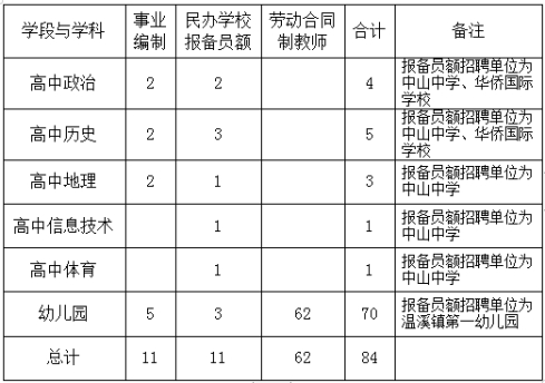 本次公开招聘高中教师14名,其中事业编制6名,民办事业单位报备员额8名;幼儿园教师70名,其中事业编制5名,民办事业单位报备员额3名,劳动合同制教师62名。具体岗位及职数见下表: