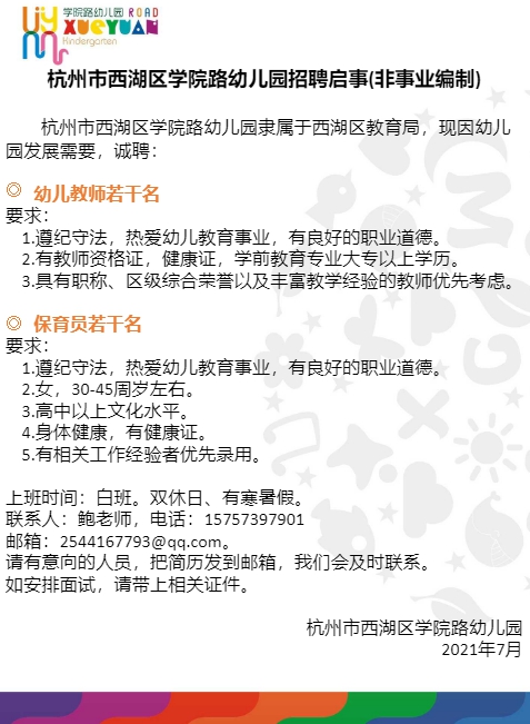 2021年浙江省杭州市西湖区学院路幼儿园教师招聘的启事