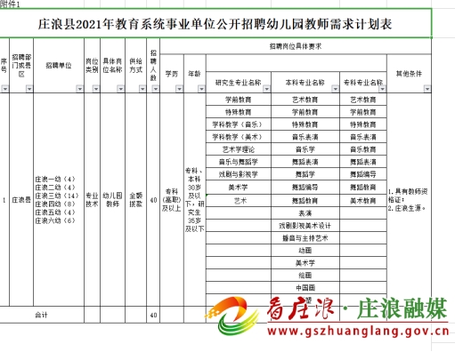 庄浪县2021年教育系统事业单位公开招聘幼儿园教师共40名(具体招聘名额及岗位见附件1)。编制使用教育系统幼儿园教师专项编制。