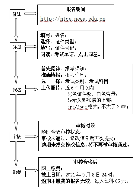 5.缴费。采用网上缴费方式,考生网上报名后需等待考试机构对考生的信息审核合格后方可进行缴费。网上缴费截止日期为:2021年9月8日24时,逾期不缴费的报名无效。根据津发改价费〔2016〕712号文件规定,我市全国中小学教师资格考试收费标准为:笔试费每科65元。