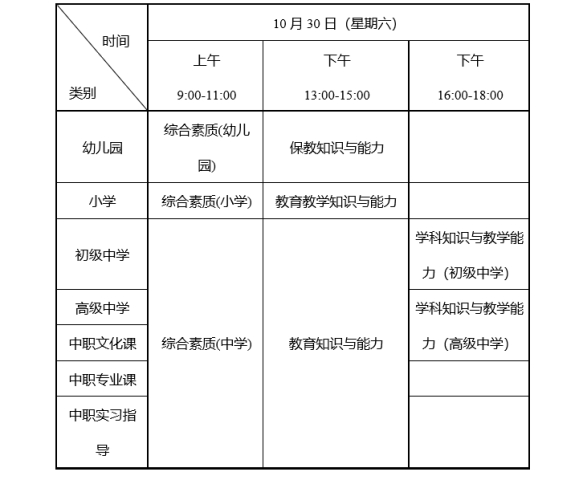 (四)全国统一考试时间为10月30日,各类别考试科目与时间安排如下:
