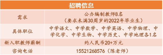 招聘公办学校编制内教师8名,其中中学语文、中学数学、中学英语、中学物理、中学化学、中学生物、中学历史、中学地理各1名,年薪约20多万元,具体职位代码及要求见下图。(咨询电话15521268576陈老师)