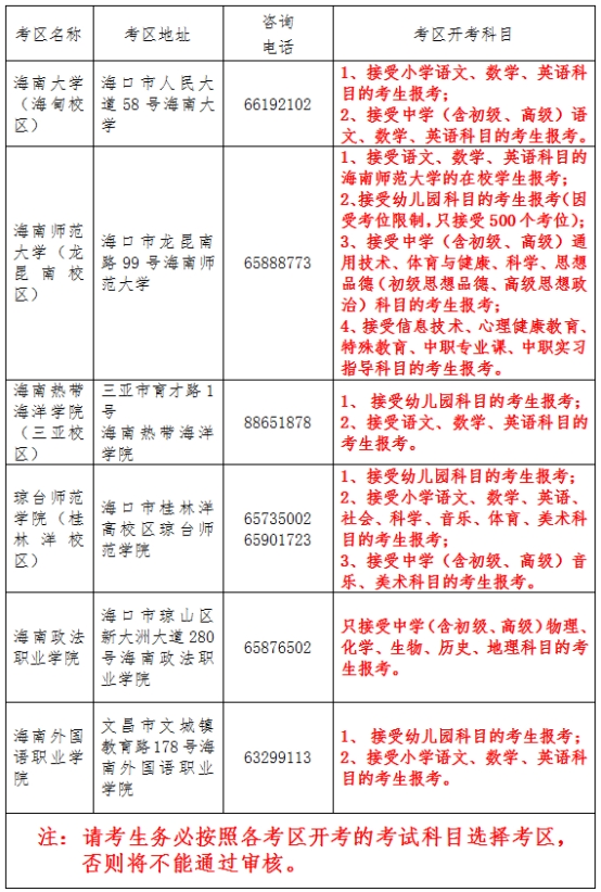 我省2021年下半年中小学教师资格考试面试共设海南大学(海甸校区)、海南师范大学(龙昆南校区)、海南热带海洋学院(三亚校区)、琼台师范学院(桂林洋校区)、海南政法职业学院和海南外国语职业学院六个考区,报名结束后各考区根据实际报名情况设置考点,考生参加考试的考点名称与地址以准考证上的为准。现将考区信息公布如下: