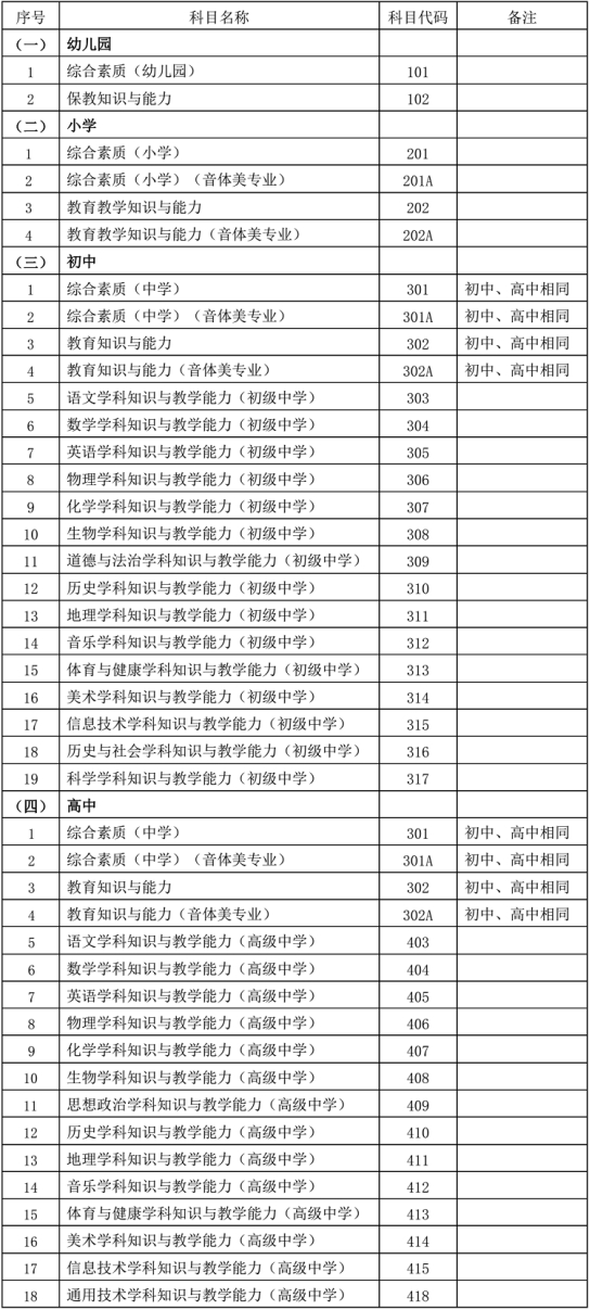 中小学教师资格考试(笔试)科目代码列表